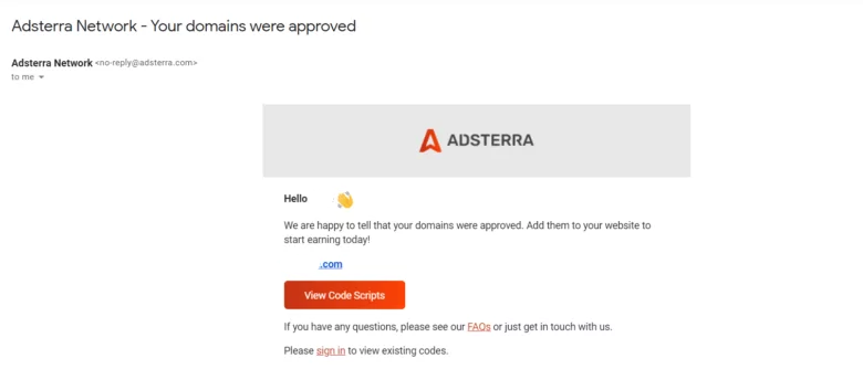 Xong! Sau khi yêu cầu của bạn được chấp thuận. Quá trình này thường chỉ mất vài phút, bạn có thể sao chép tập lệnh từ tài khoản của mình (cũng như từ trang Liên kết Trực tiếp) hoặc từ email hệ thống mà bạn sẽ nhận được từ Adsterra.